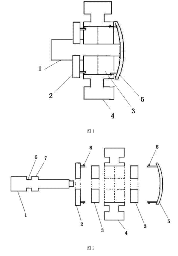 圖中:1-軸芯,2-內(nèi)密封蓋,3-軸承,4-輪子,5-外密封蓋,6-凹槽,7-內(nèi)隔擋,8-凸環(huán)。